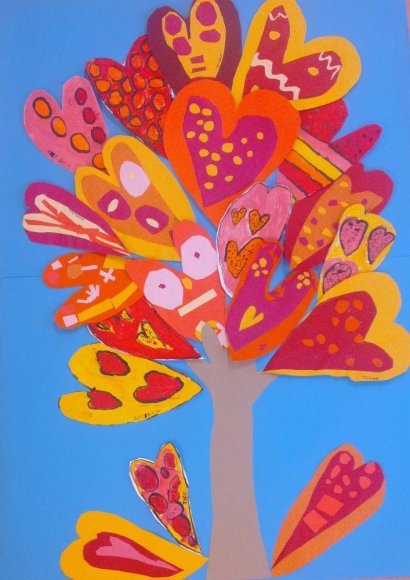 Kolektivy žáků napříč všemi ročníky vyráběly rozmanitá srdce pro Hanku, z nichž jsme utvořili výstavu ve školní jídelně.