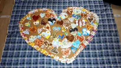 Kolektivy žáků napříč všemi ročníky vyráběly rozmanitá srdce pro Hanku, z nichž jsme utvořili výstavu ve školní jídelně.