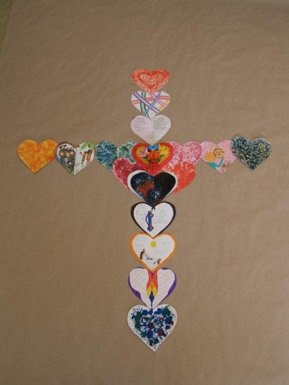 Kolektivy žáků napříč všemi ročníky vyráběly rozmanitá srdce pro Hanku, z nichž jsme utvořili výstavu ve školní jídelně.