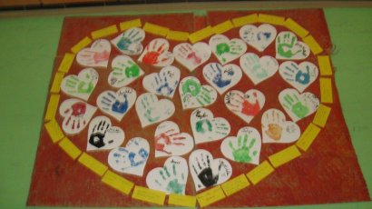 Kolektivy žáků napříč všemi ročníky vyráběly rozmanitá srdce pro Hanku, z nichž jsme utvořili výstavu ve školní jídelně.