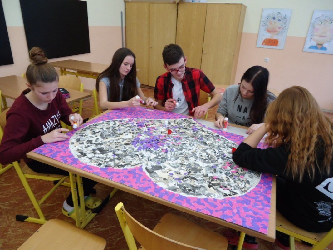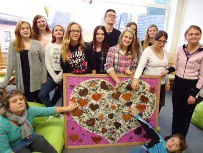 Kolektivy žáků napříč všemi ročníky vyráběly rozmanitá srdce pro Hanku, z nichž jsme utvořili výstavu ve školní jídelně.