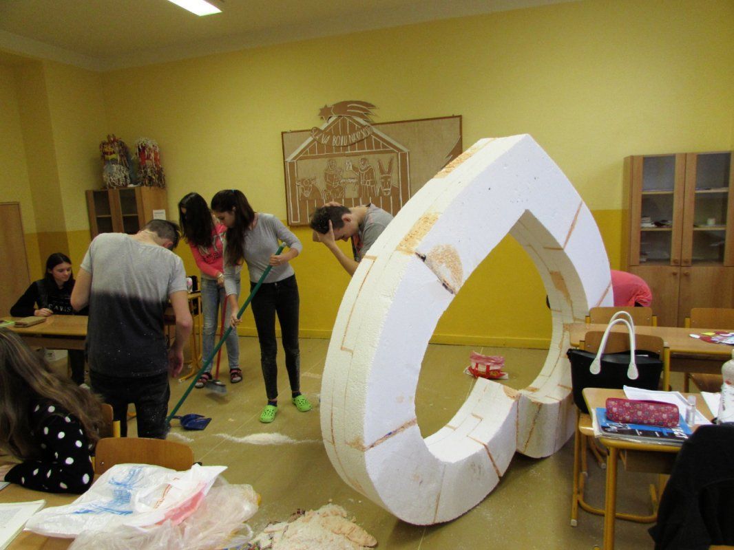 Kolektivy žáků napříč všemi ročníky vyráběly rozmanitá srdce pro Hanku, z nichž jsme utvořili výstavu ve školní jídelně.