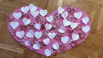 Kolektivy žáků napříč všemi ročníky vyráběly rozmanitá srdce pro Hanku, z nichž jsme utvořili výstavu ve školní jídelně.