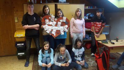 Kolektivy žáků napříč všemi ročníky vyráběly rozmanitá srdce pro Hanku, z nichž jsme utvořili výstavu ve školní jídelně.