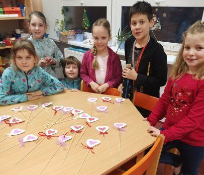 Kolektivy žáků napříč všemi ročníky vyráběly rozmanitá srdce pro Hanku, z nichž jsme utvořili výstavu ve školní jídelně.