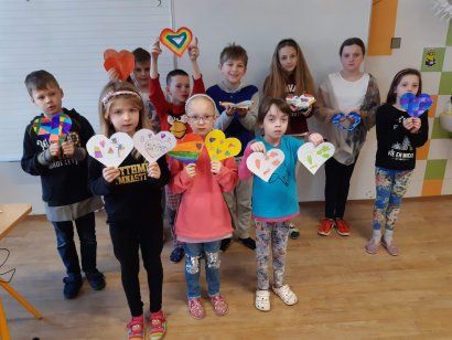 Kolektivy žáků napříč všemi ročníky vyráběly rozmanitá srdce pro Hanku, z nichž jsme utvořili výstavu ve školní jídelně.
