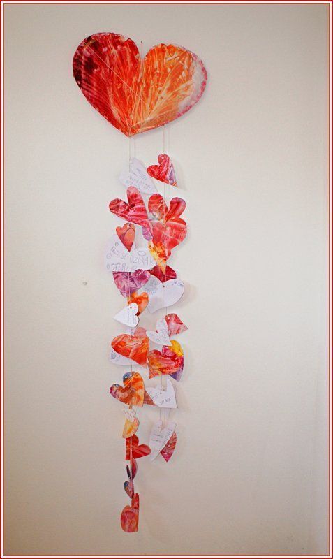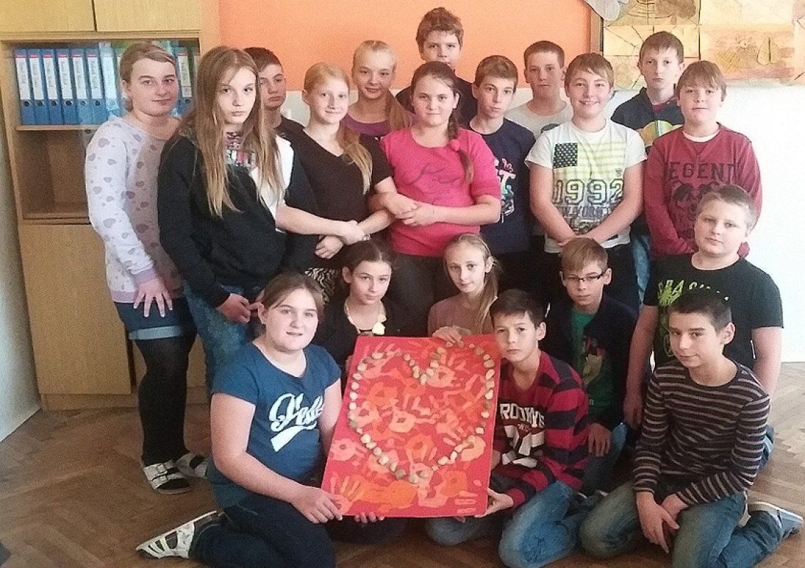 Kolektivy žáků napříč všemi ročníky vyráběly rozmanitá srdce pro Hanku, z nichž jsme utvořili výstavu ve školní jídelně.